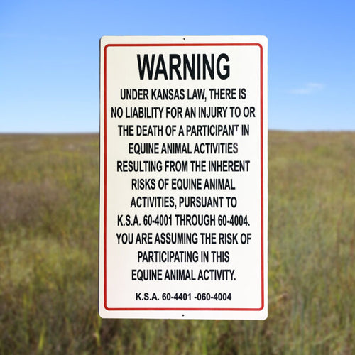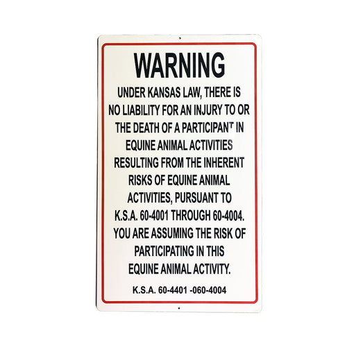 Equine Liability Signs for the state of Kansas. 12″ x 8″ choose from Horizontal or Vertical hanging. Sign reads as below: